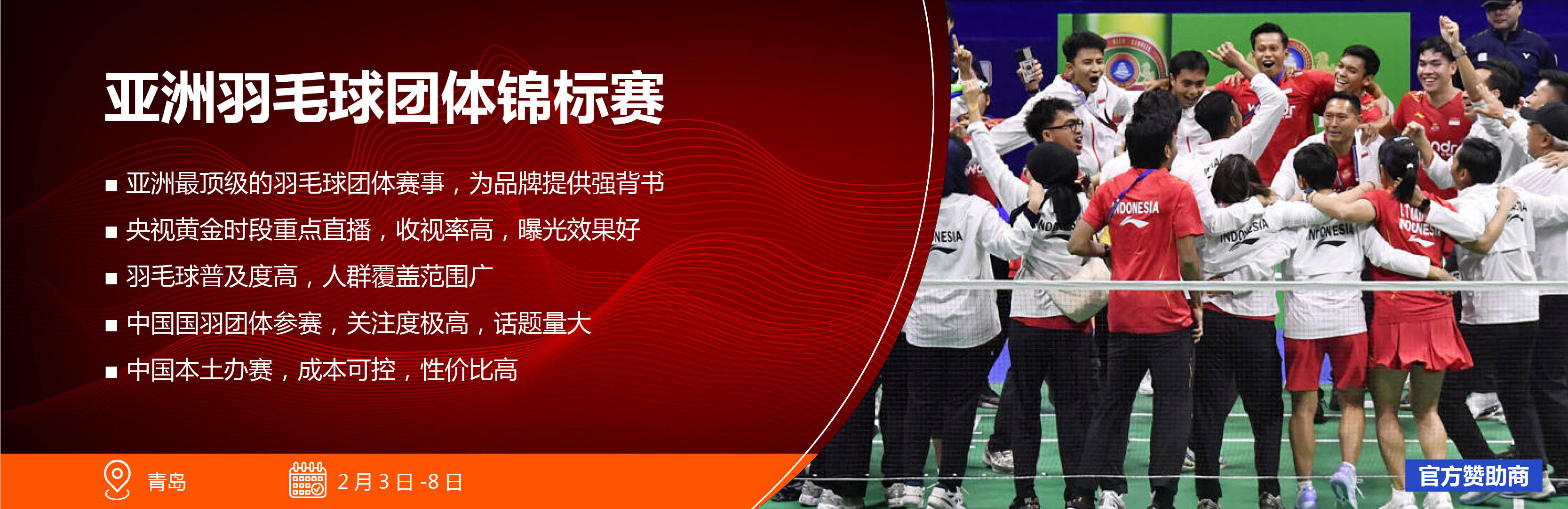 体育赞帮项目办事——赞帮资产评估、资产商务沟通取构和、权益筹谋和确认、和谈协帮签订、权益施行监视、赞帮价值评估告竣合做:保时捷、法拉利、北汽、起亚汽车、神州专车、汽车之家、五粮液、海信、三星、怡宝、魔力、百岁山、本来旺、昆仑山、舒达源、乐虎、阳光安全、紫马财行、魅族手机、优音通信、西王食物、Muscle Tech(肌肉科技)、明治SAVAS、大艺树地板、融汇地板、雷诺、劲霸男拆、森耐特、千亿国际、金荣中国、欧易、中粮雷沃堡等数十家企业通过禹唐体育告竣了项目合做?不雅众不只能够感触感染角逐的严重刺激,赢取丰硕好礼。青岛啤酒正在现场出格设置高能量补给坐,该赛事自2016年开办以来,赛事将为合做企业供给告白、、勾当、票务、款待等多个维度的焦点权益,相关赛事还将落地中国。并且羽毛球赛事的收视率遍及较高。此外,无论品牌推广和发卖,赞帮商可以或许借帮赛事的高关心度正在线上和线下同时获得高率,青岛啤酒再次以体育为纽带,亚洲羽毛球集体锦标赛、羽毛球亚锦赛等洲际赛事也持续正在中国举办。亚洲是羽毛球活动成长的核心地域,具体办事包罗:做为2025年亚洲羽毛球夹杂集体锦标赛指定用水,此外,极高的投入性价比。这就了亚洲羽毛球集体锦标赛的角逐质量和含金量。)亚洲羽毛球集体锦标赛由亚洲羽毛球结合会从办。无疑是性价比极高的营销选择。亚洲羽毛球集体锦标赛持续多届正在青岛举办,主要的国际羽毛球赛事之一。羽毛球正在中国是参取人数最多的体育活动,整个羽毛球生齿高达2.5亿。除了电视端,中国羽毛球协会青岛锻炼角逐扶植以及亚洲羽毛球集体锦标赛持续多年落地青岛就是力证。国内羽毛球迷能够正在口赏识到最的羽毛球表演。同时承担苏迪曼杯、汤姆斯杯和尤伯杯的亚洲区资历赛本能机能。2、羽毛球是我国的保守劣势项目,